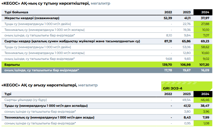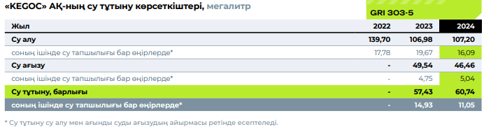 Компанияның технологиялық процесінде су пайдаланылмайды. «KEGOC» АҚ-да суды тұтыну көлемі шамалы, және Компания қызметі су көздеріне айтарлықтай әсерін тигізбейді. Компания тұрмыстық тұтыну үшін суды қалалық сумен жабдықтау жүйесінен пайдаланады және суды жер үсті көздерінен (өзендер, көлдер және т.б.) жинамайды. 7 ЖЭТ филиалының объектілерінде артезиандық сумен жабдықтау жүйесі бар, ұңғымалар алынған арнайы суды пайдалануға рұқсаттарға сәйкес пайдаланылады. Қазақстан Республикасының Су кодексіне сәйкес мамандандырылған ұйымдармен жасалған шарттар бойынша ұңғымалардың су жинағышында жер асты суларына тұрақты негізде мониторинг жүргізіліп тұрады.