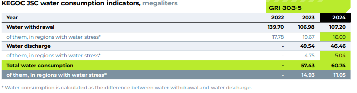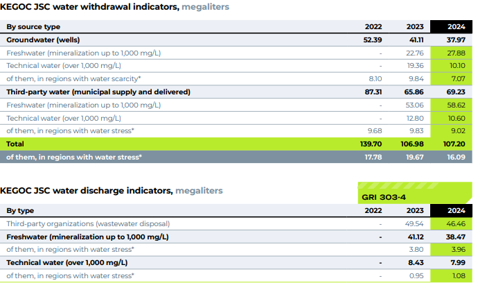 Water is not used in the technological process of the Company. The volume of water consumption in KEGOC JSC is insignificant, the Company’s activities do not have a significant impact on water sources. The company uses water for domestic consumption from the urban water supply system and wells, water intake from surface sources (rivers, lakes, etc.) is not carried out. There is an artesian water supply at the facilities of 7 branches of the MES, wells are operated according to the received permits for special water use. In accordance with the Water Code of the Republic of Kazakhstan, groundwater monitoring is carried out on an ongoing basis at the water intake of wells under contracts concluded with specialized organizations.
